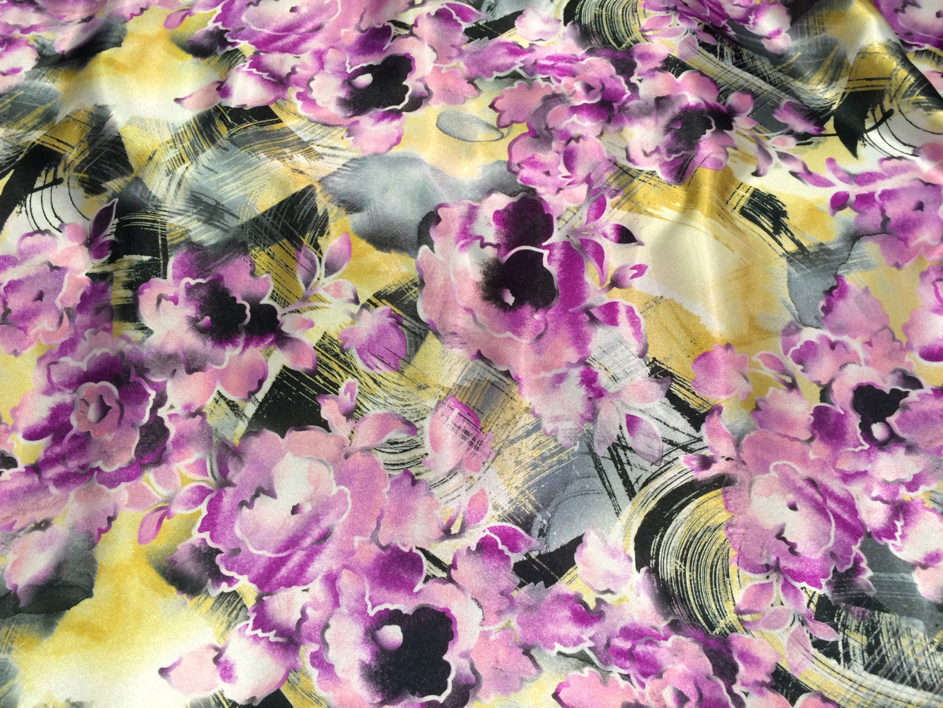 An abstract design satin pillowcase with pink flowers and yellow and black swirls.