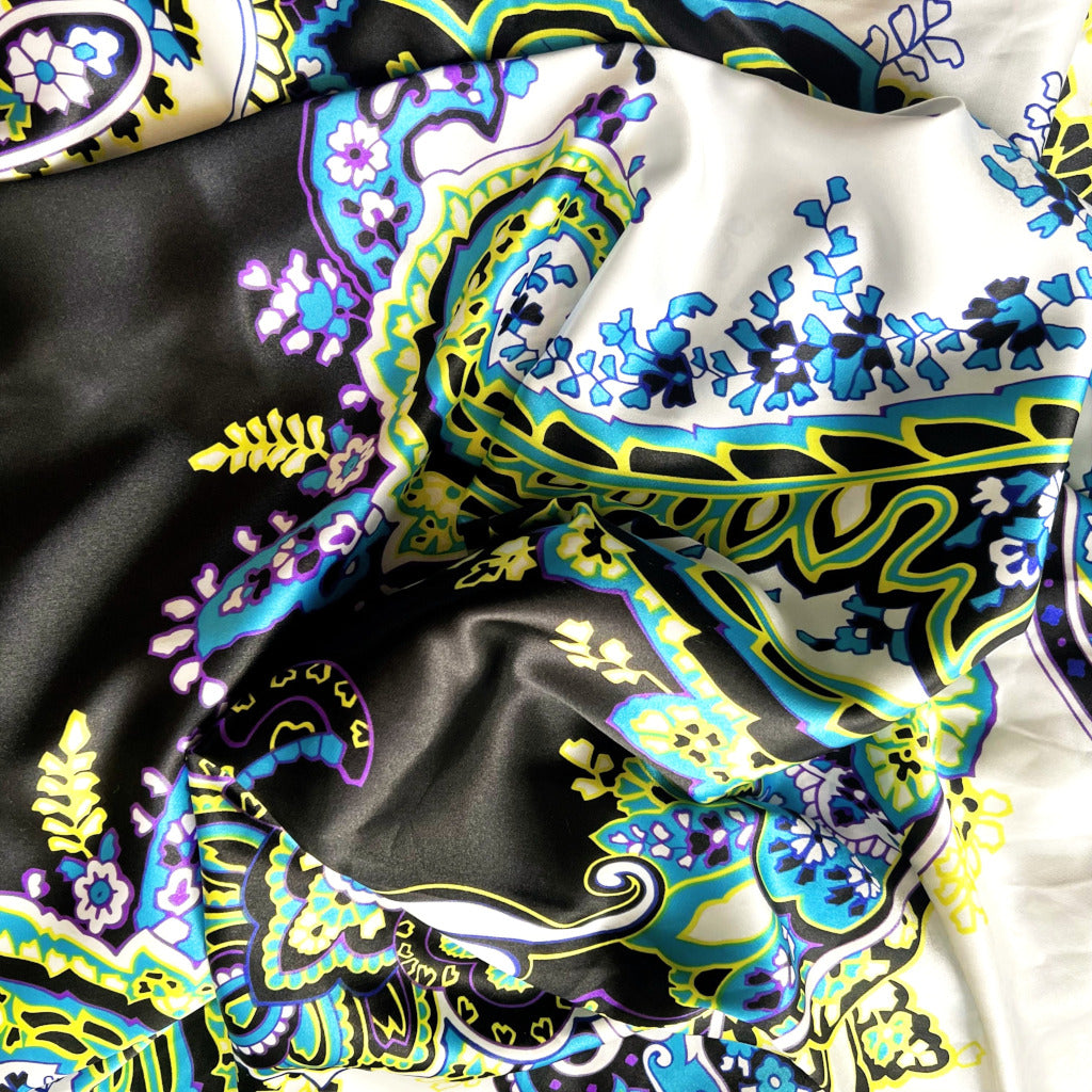 Our white, black, turquoise blue, yellow and white with purple accent print satin pillowcase is made from luxurious charmeuse satin and finished with beautifully stitched French seams. A beautiful paisley design.
